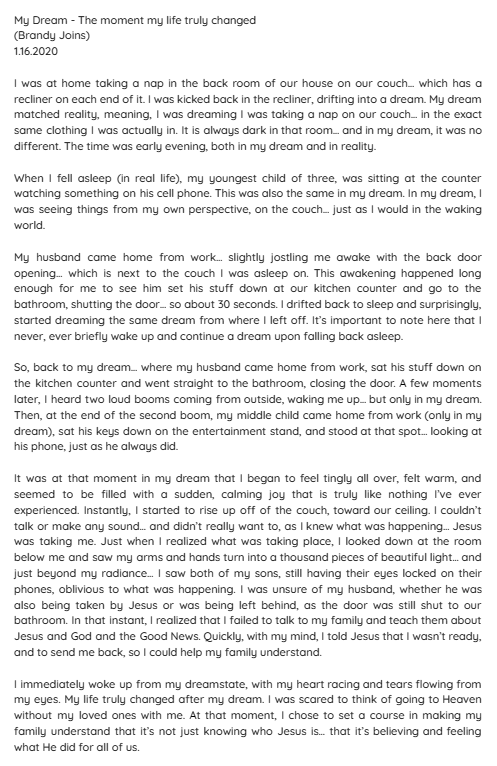 THESE ARE MY PERSONAL TESTIMONIES. THESE ARE THE MOMENTS GOD COMMUNICATED WITH ME. (click on image to view) Dream - 1.16.2020